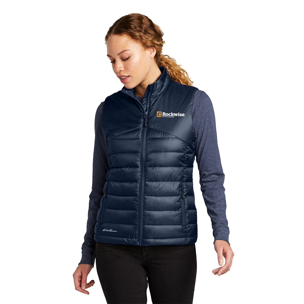 Minimal bulk meets maximized performance in this quilted vest that is built for your cold-weather adventures. Exposed, molded zippers with Eddie Bauer logo pulls. Zippered hand pockets. Contrast Eddie Bauer heat transfer logo on right hem. Made of 100% polyester shell and lining. 3-ounce, 100% polyester fill. Durable water-repellent (DWR) finish with a PU coating.